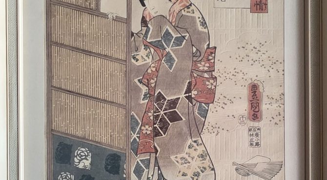 This beautiful Japanese artwork is an original mid-19th century woodblock print (ukiyo-e),...
