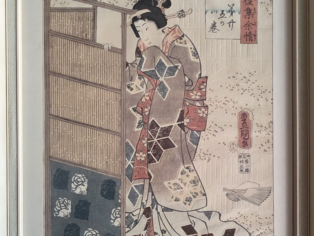This beautiful Japanese artwork is an original mid-19th century woodblock print (ukiyo-e),...